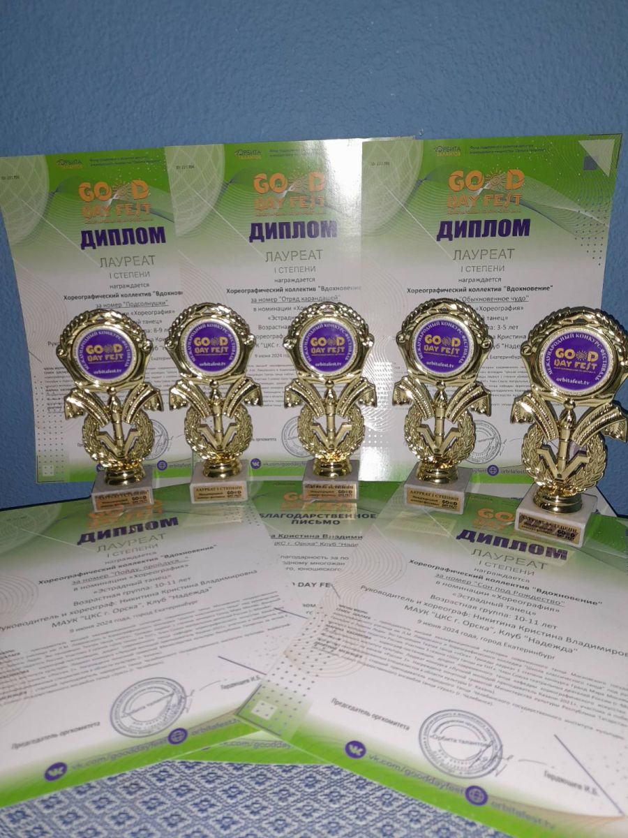 Хореографический коллектив "Вдохновение" клуба "Надежда" (руководитель Никитина К.В.) с успехом выступили на международном фестивале-конкурсе "GOOD DAY FEST" в Екатеринбурге. 6 дипломов I степени теперь в копилке наград коллектива. Поздравляем руководителя и участников коллектива с заслуженной победой!