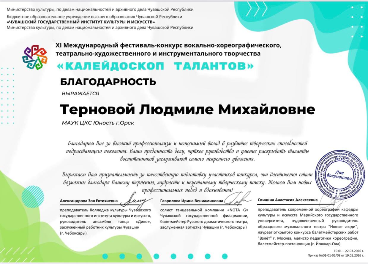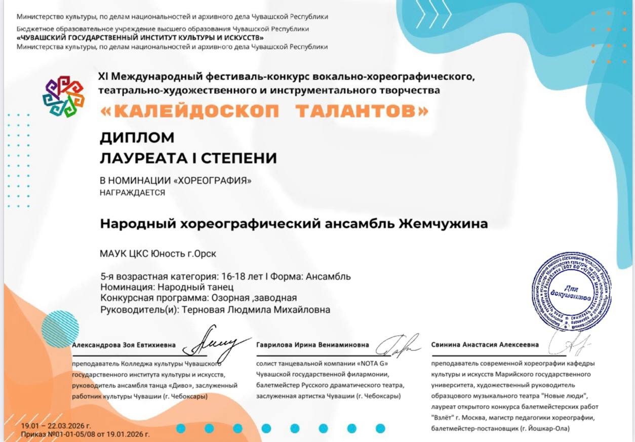 Народный хореографический коллектив "Жемчужина" стали лауреатами I степени международного фестиваля - конкурса "Калейдоскоп талантов"! Поздравляем участников и руководителя Терновую Людмилу Михайловну и благодарим за профессионализм и высокий уровень подготовки. Дальнейших побед вам и неиссякаемого творческого огня!