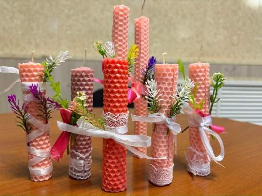 Ребята освоили технику создания восковых свечей из вощины — натурального материала, придающего готовым изделиям особый тёплый оттенок и приятный медовый аромат.
