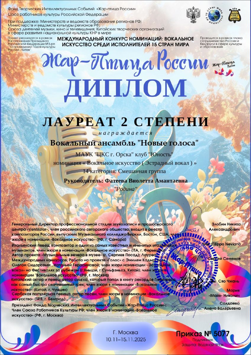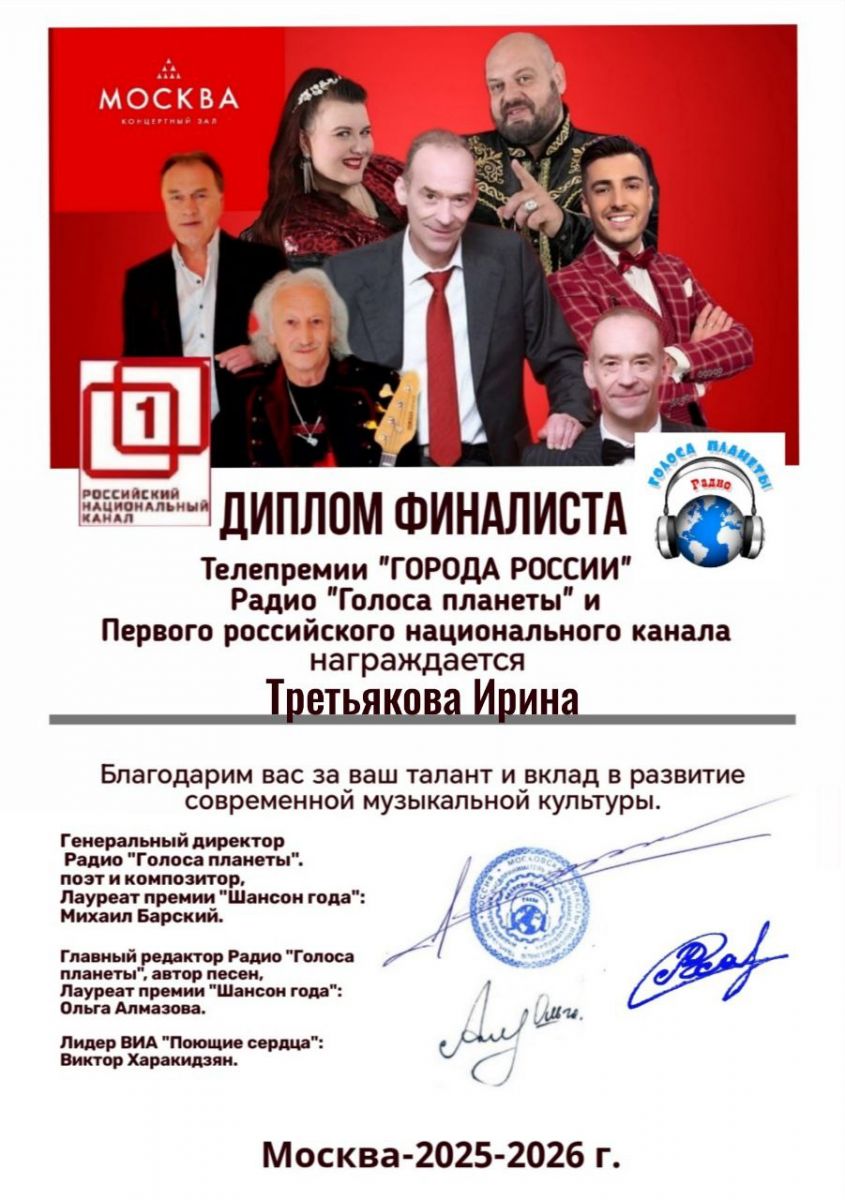 И, несмотря на то. что ансамблю "Новые голоса"только 3 года, они уже успели заявить о себе в различных конкурсах и фестивалях. Их копилка достижений пополнилась еще одной наградой: дипломом 2 степени международного конкурса "Жар-птица России". А участница коллектива Третьякова Ирина участвовала в конкурсе Телепремии "Города России" и получила Диплом финалиста.