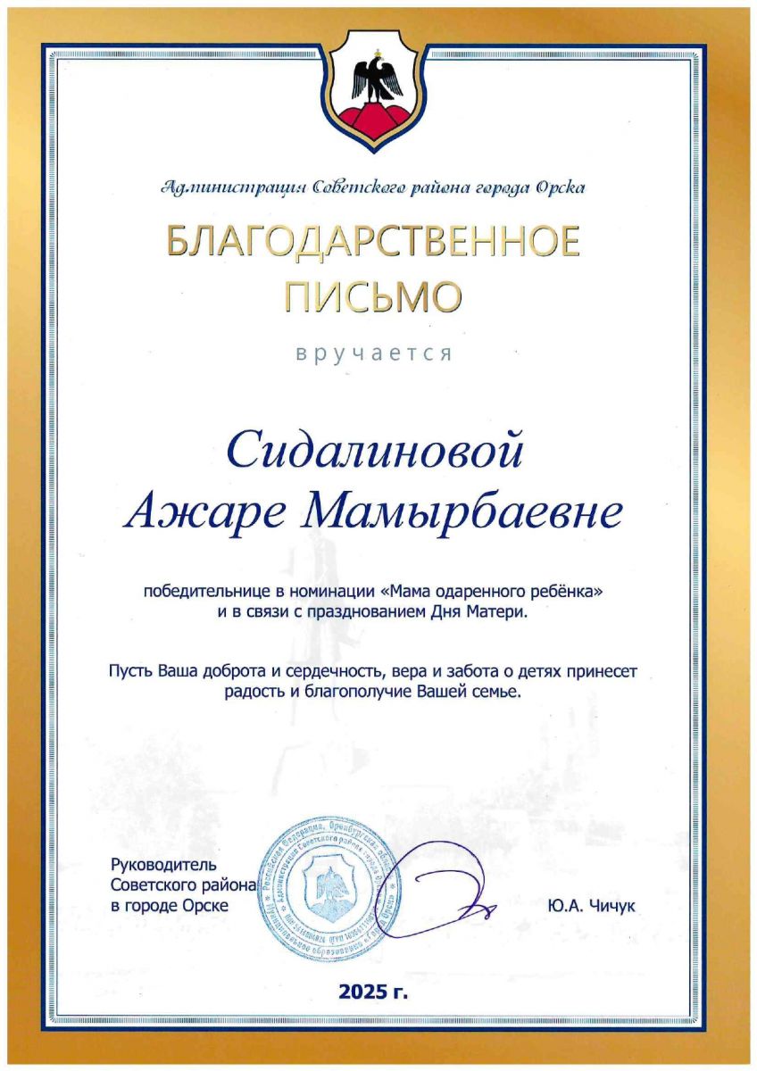 Особого признания удостоилась Сидалинова Ажара Мамырбаевна — заведующая филиалом централизованной клубной системы (клуб села Ора). Она стала победительницей в номинации «Мама одаренного ребёнка».