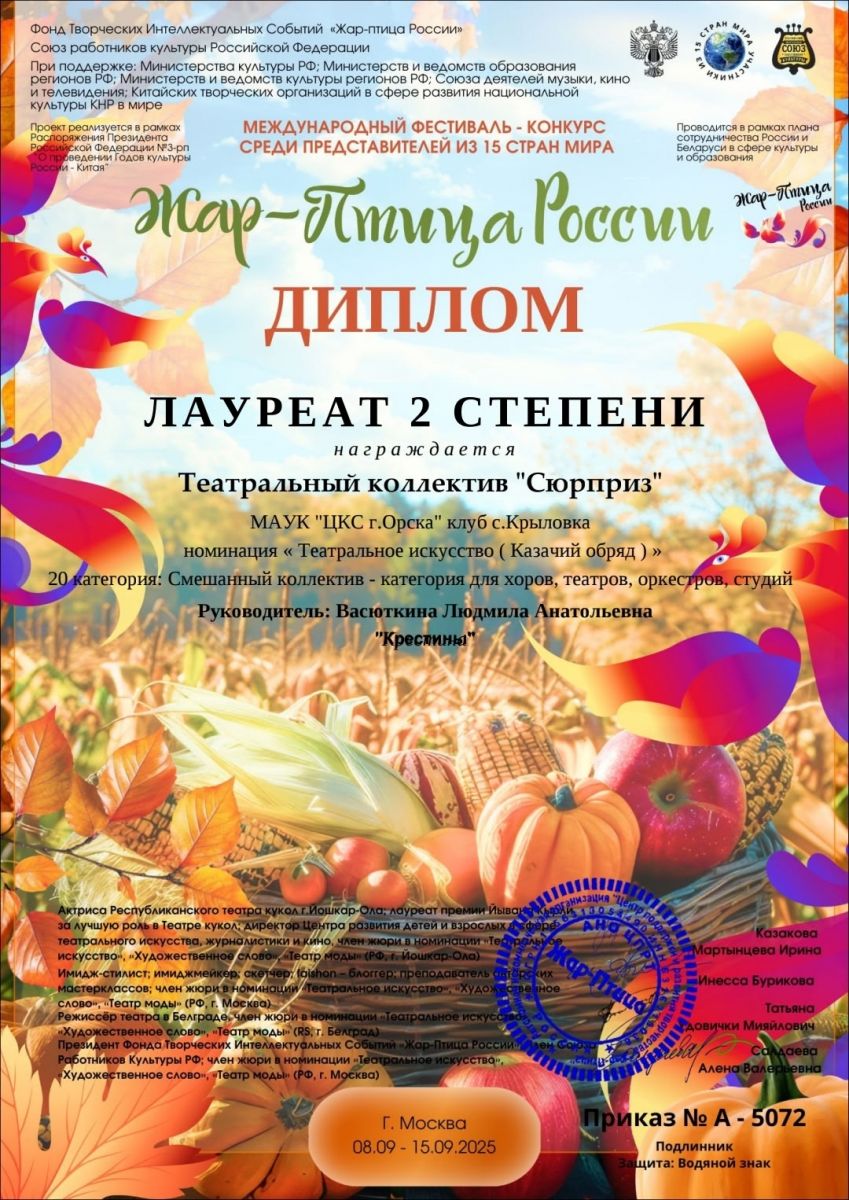 В нем принимали участие творческие коллективы клуба села Крыловка. В номинации "Театральное казачество" диплом 2 степени завоевал театральный коллектив "Сюрприз"(руководитель Васюткина Людмила Анатольевна) с казачьим обрядом "Крестины".