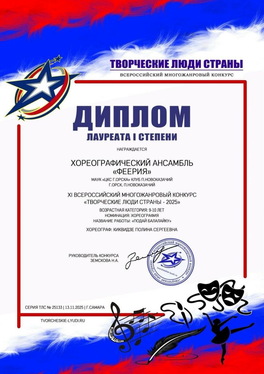 Детская и взрослая группы хореографического ансамбля "Феерия" клуба поселка Новоказачий приняли участие в XI Всероссийском конкурсе талантов "Время творчества -2025". Они представили хореографические композиции "Плывет веночек" и "Подай балалайку" и стали лауреатов 1 степени.