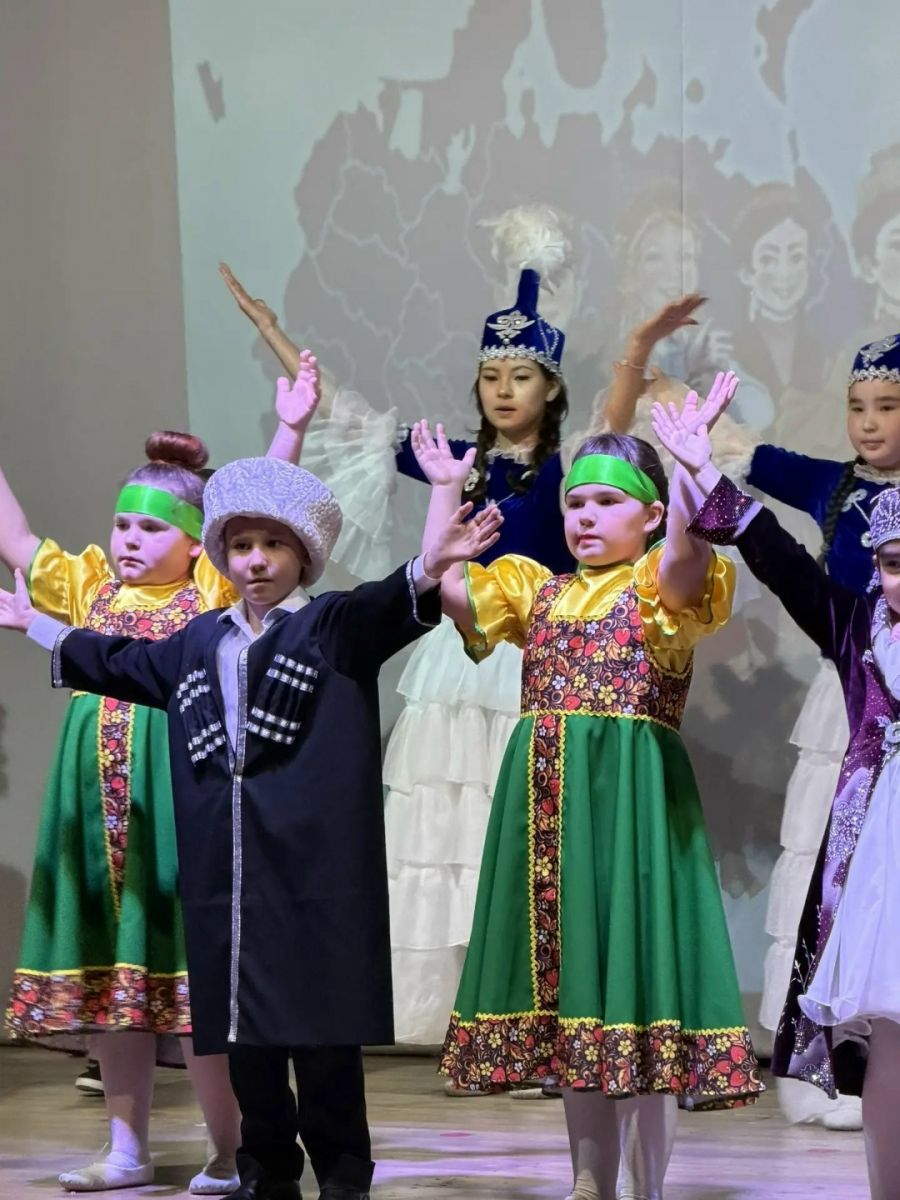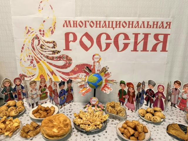 Гостей уже в фойе ждала красочная выставка "Многонациональная Россия", где были представлены коллекция кукол в национальных костюмах народов России, дегустация традиционных блюд разных культур.